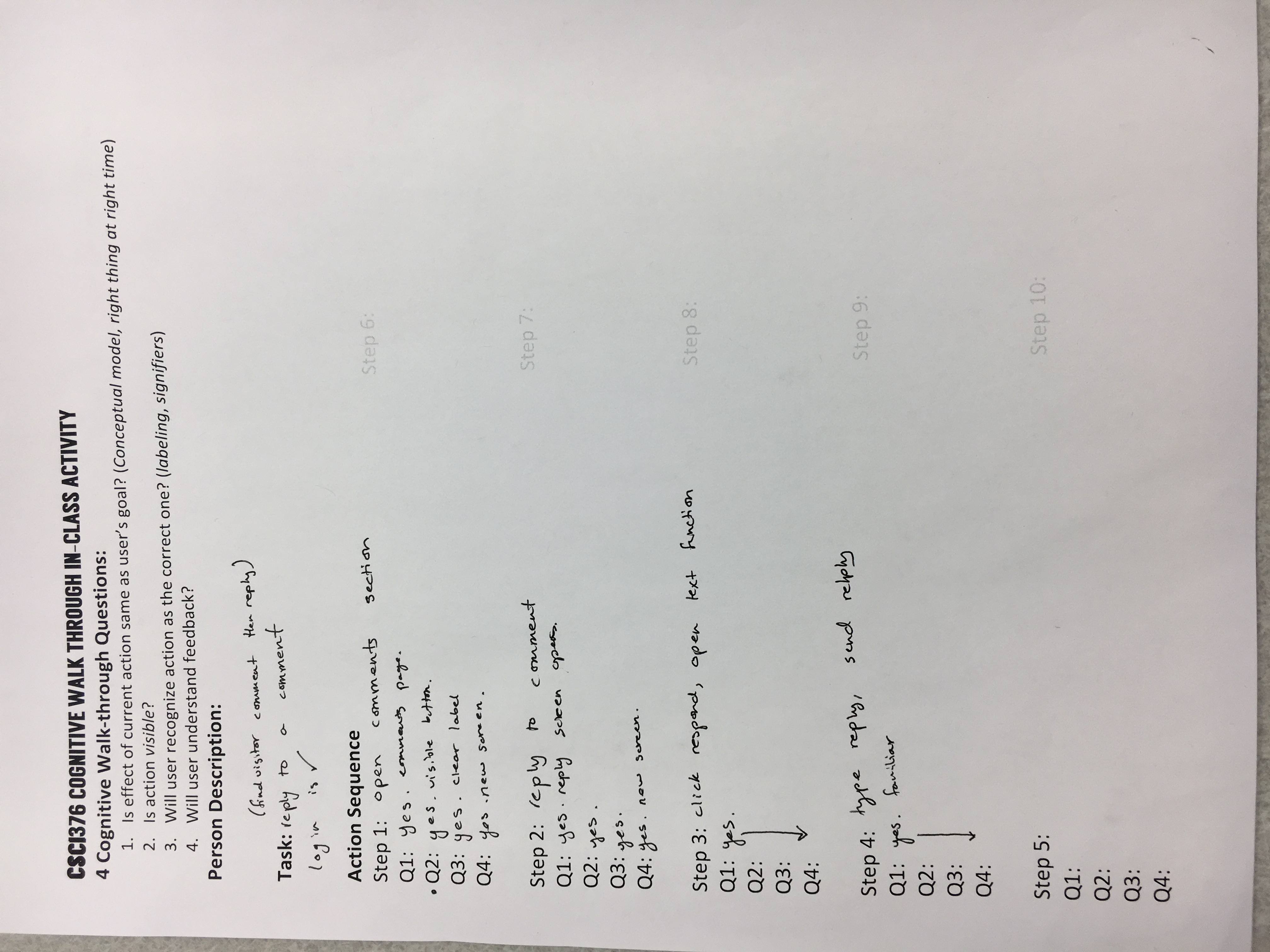 The second step in our testing process was a cognitive walkthrough that we completed in class. Our cognitive walk-through proved to be relatively unexciting because our hueristic evaluators were quite attentive to issues. A lot of their feedback fixed problems that otherwise would have come up in the walkthrough. We also may be too close to the project, because we weren’t able to come up with issues as we walked through the app. It may have been useful to do a cognitive walkthrough with an outside perspective. After our cognitive walkthrough, we decided to be more specific about the tasks we presented to people in order to help them navigate the paper prototype (discussed more in the “testing results” section). Here is our completed cognitive walkthrough worksheet from class: